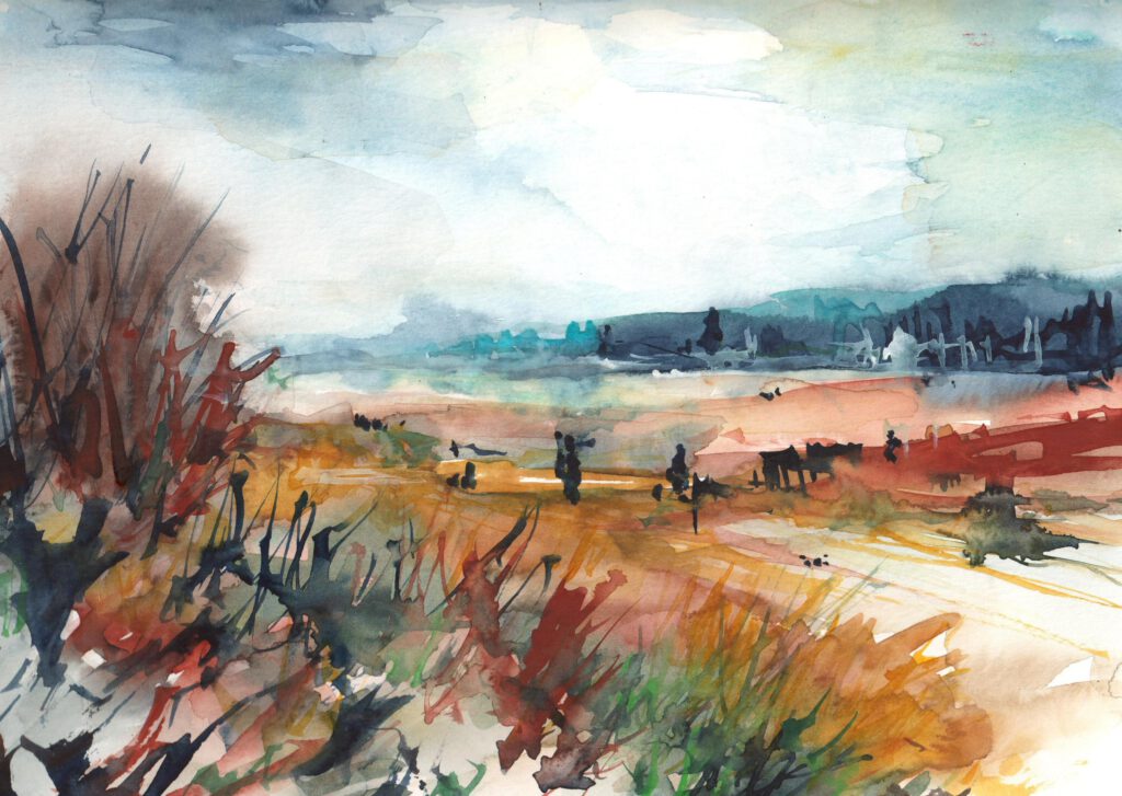 Drei Aquarelle 17. Oktober 2025 in Malerisches Hohes Venn im Winter (oben), Hohes Venn (Mitte), Weiher im Park (unten)